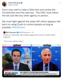 “Fauci may want to take a little time and review the Constitution and the case law. The CDC must follow the law just like any other agency or person. We must fight against the woke-left which appears hell bent on using Covid to control people as long as possible.”