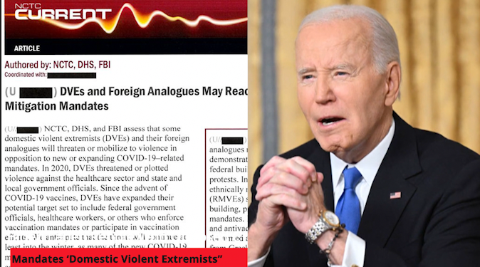 Biden administration labeled U.S. citizens who opposed the C*VID-19 mandates as “Domestic Violent Extremists,” according to newly declassified intelligence records.