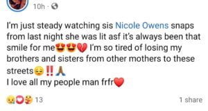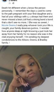 “I remember the days u used to come to the park pregnant with your first daughter and u had all your siblings with u, u always had them and never missed a beat,” one post said, ” I really pray whoever took your life is caught, your family deserves justice…! I wonder how anyone sleep at night knowing u just took her away from her family for no reason she was in the club enjoying herself..!”