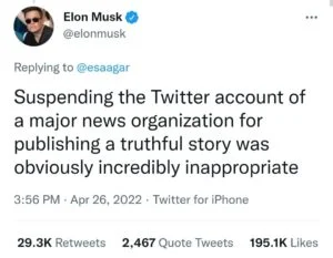 “suspending the Twitter account of a major news organization for publishing a truthful story was obviously incredibly inappropriate.”