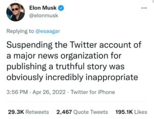The new owner of Twitter took to his own platform to seemingly call out the Big Tech Giant for suspending The New York Post just months before the 2020 Presidential election after they posted a story about Hunter Biden’s Laptop from hell saying,