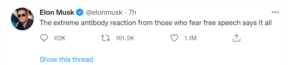 Musk also tweeted about the visceral reaction that liberals, democrat politicians and mainstream media outlets are having to his purchase asserting that their reaction to a free speech possibility tells us everything we need to know,