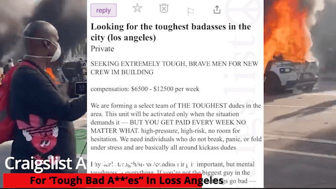 A Craigslist posting is advertising work that appears to be for the Los Angeles riots, saying they will pay people $6,500 to $12,500 per week to be “tough brave men” in Los Angeles