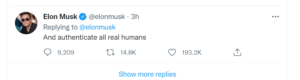 “If our twitter bid succeeds, we will defeat the spam bots or die trying.. And authenticate all real humans….A top priority I would have is eliminating the spam and scam bots and the bot armies that are on Twitter,”