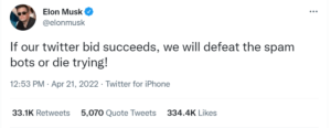 “If our twitter bid succeeds, we will defeat the spam bots or die trying.. And authenticate all real humans….A top priority I would have is eliminating the spam and scam bots and the bot armies that are on Twitter,”