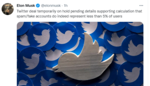 “Twitter deal temporarily on hold pending details supporting calculation that spam/fake accounts do indeed represent less than 5% of users”