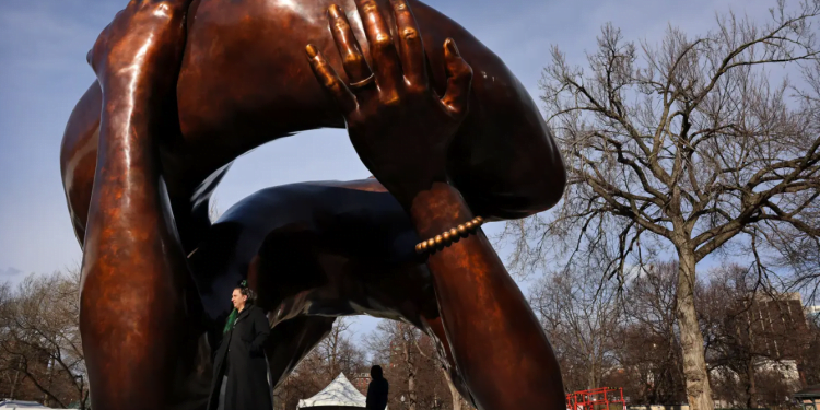 The $10 million sculpture called “The Embrace” consists of four intertwined arms and was inspired by a photo of the Kings embracing when King Jr. learned he had won the Nobel Peace Prize in 1964.