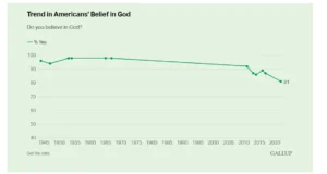 Between 1944 and 2011, more than 90% of Americans believed in God. That number staying at about 98% through the 1960’s, then dipping to 92% in 2011, dropping another 3% in 2013 and now, in 2022, sinking to 81%.